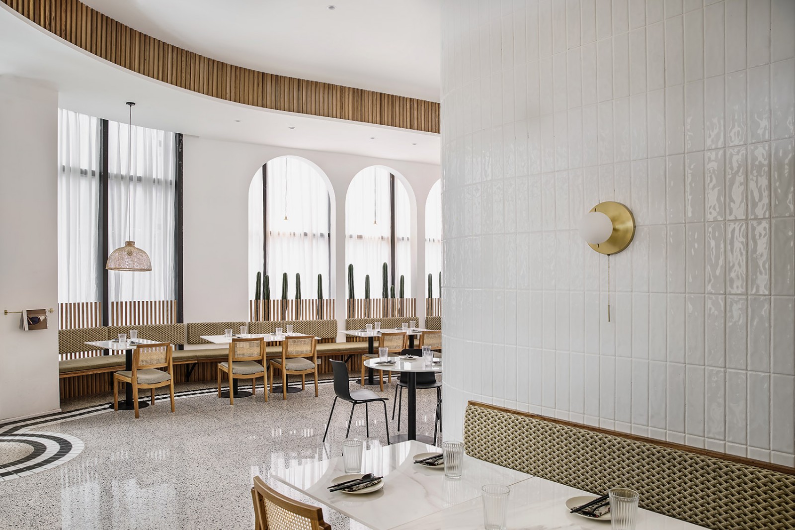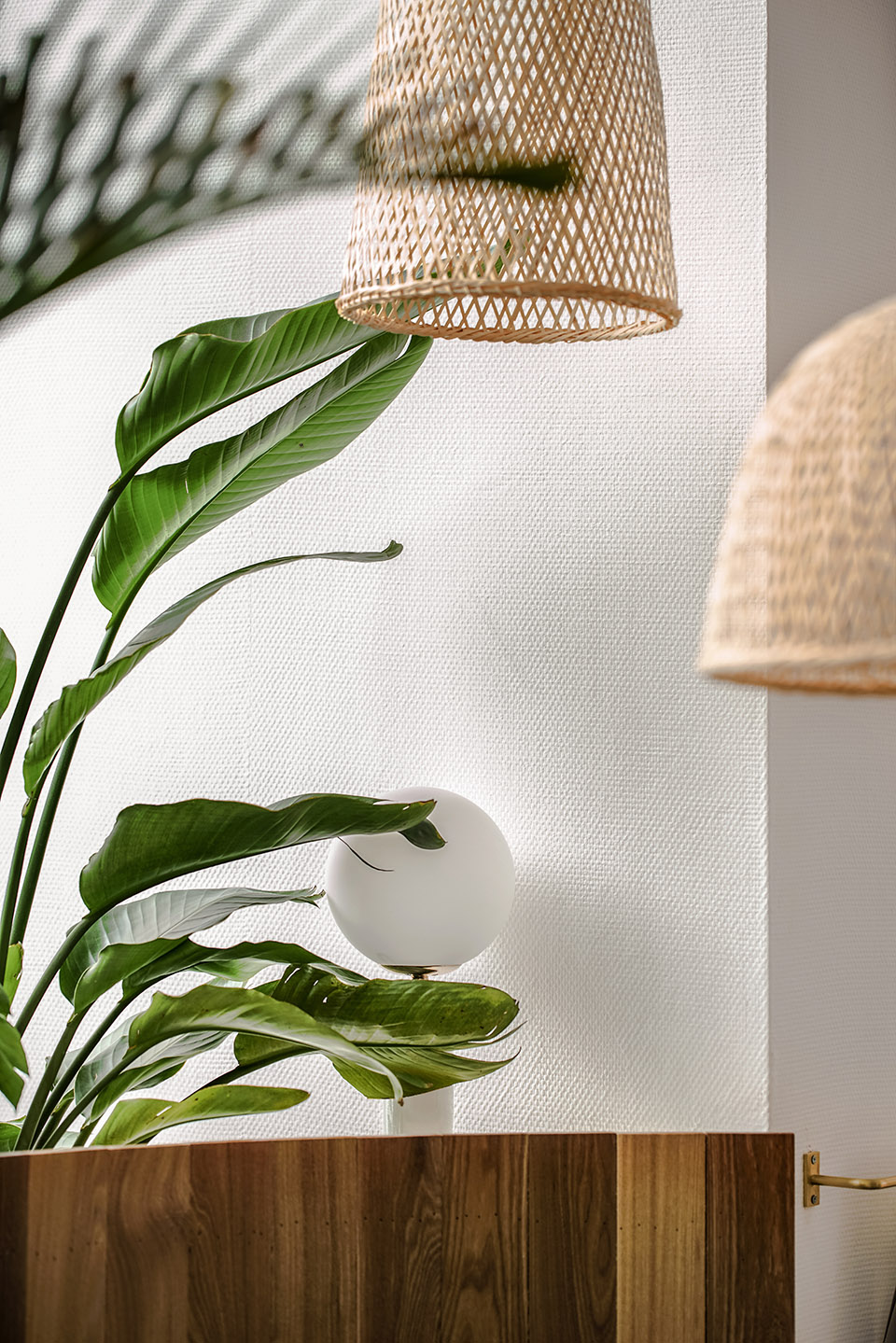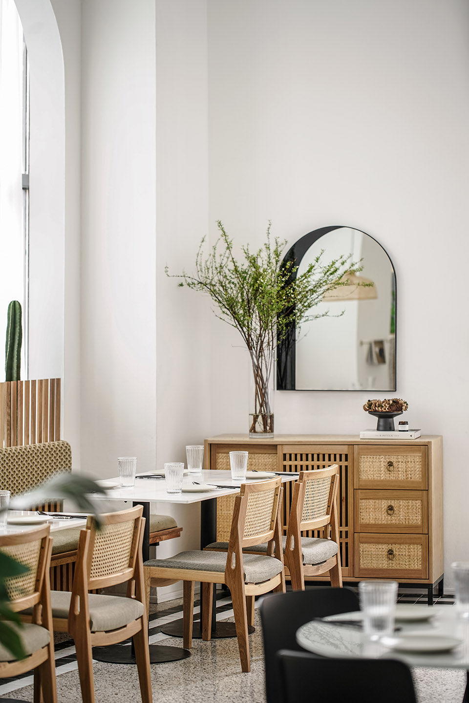 在有限的空間中劃分獨(dú)立區(qū)域圍合成弧形卡座以滿足不同客人用餐需求。恣意生長(zhǎng)的綠植和異域風(fēng)情的藤編吊燈交相輝映,更為井然有序的空間增添自然氛圍。