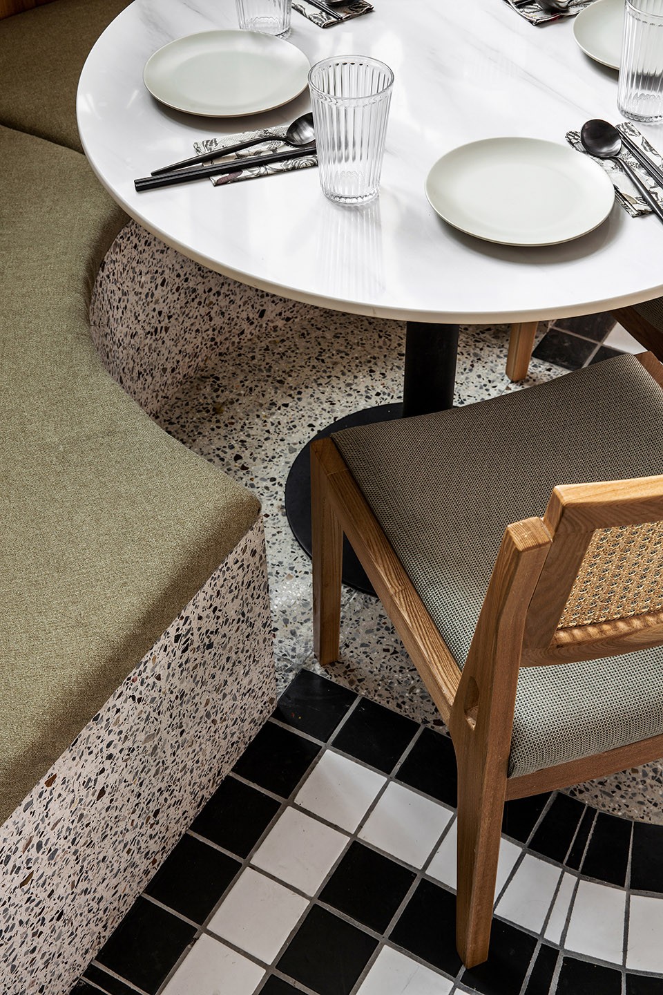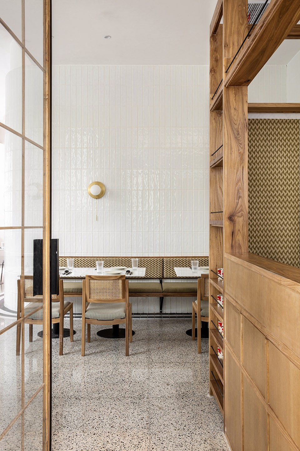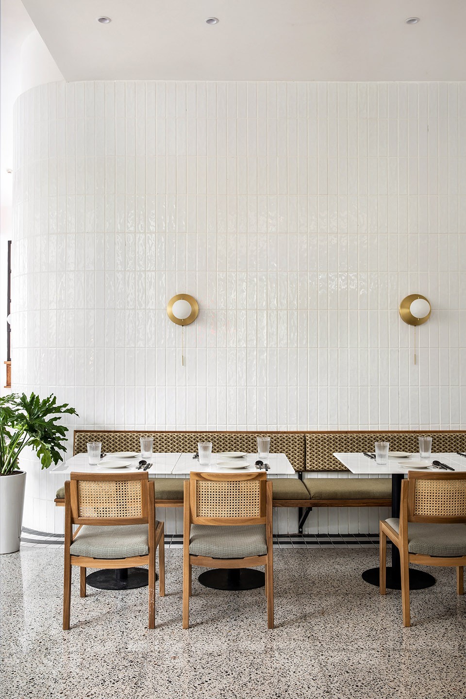 在有限的空間中劃分獨(dú)立區(qū)域圍合成弧形卡座以滿足不同客人用餐需求。恣意生長(zhǎng)的綠植和異域風(fēng)情的藤編吊燈交相輝映,更為井然有序的空間增添自然氛圍。