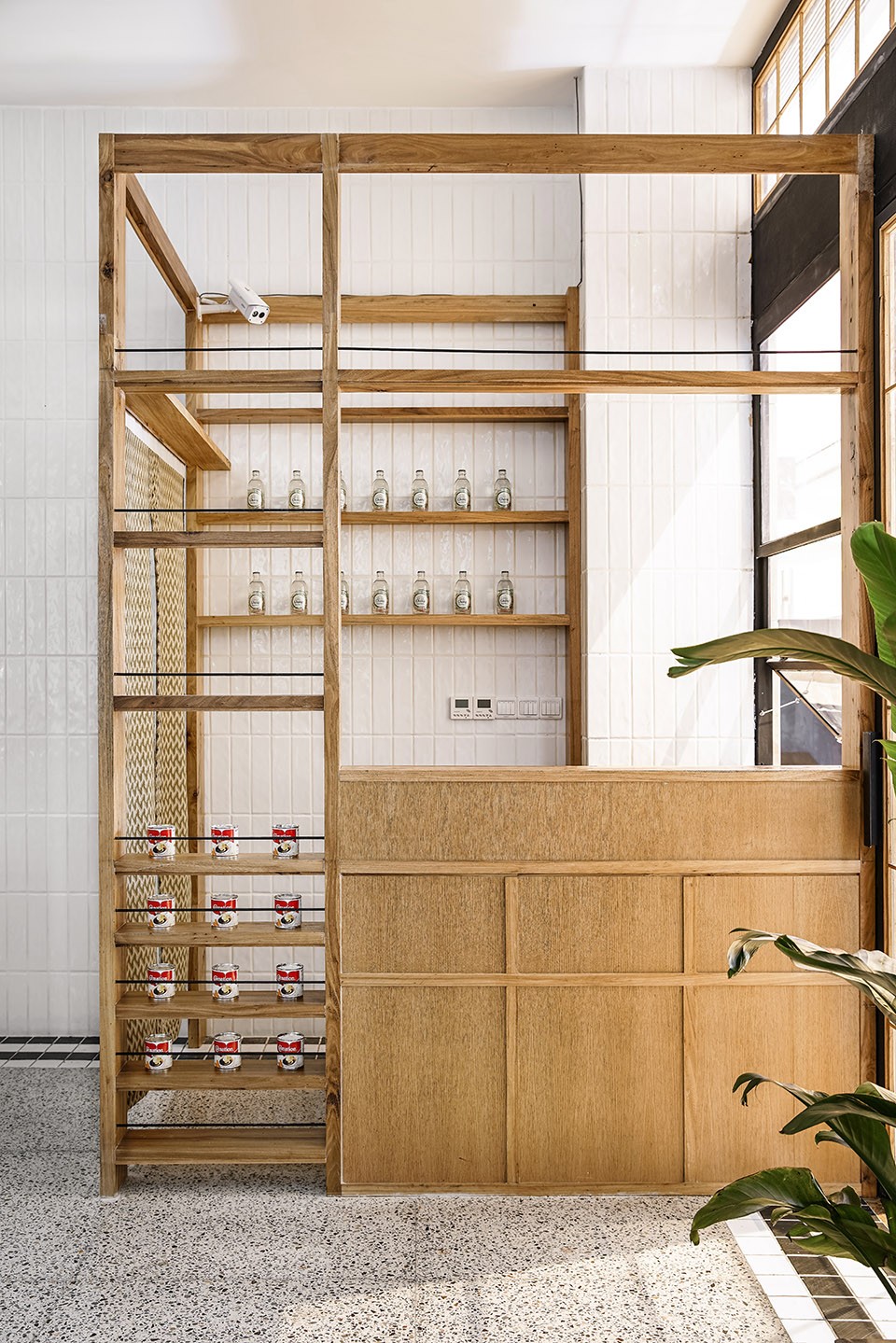▼框架木結(jié)構(gòu)吧臺(tái)在正門右側(cè),對(duì)外配合折疊推窗減少外賣取餐對(duì)室內(nèi)的干擾