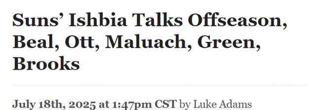 伊什比亞表示,他和新任總經理布萊恩-格雷戈里“在我們想要達成的目標上完全一致”。當被問及為何不擔心明星后衛德文-布克在未來幾年會不滿時,他再次提到了“共識”。