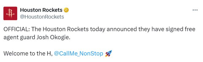 北京時間7月23日,火箭隊官方宣布,球隊已簽下自由球員后衛喬什-奧科吉。據此前名記Shams報道,火箭和奧科吉簽下的是一份1年310萬美元的合同。