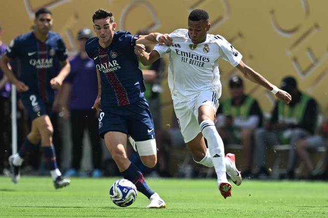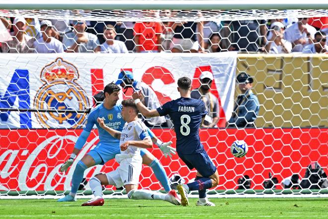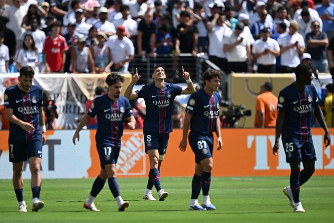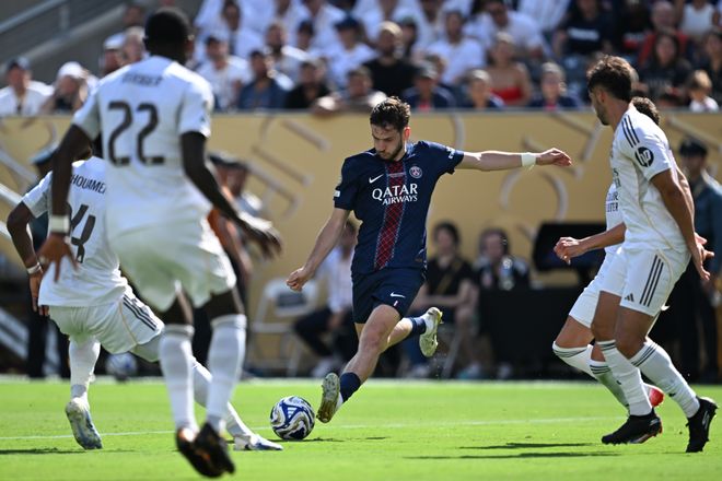 第24分鐘,登貝萊又一腳直塞打穿防線,阿什拉夫助攻魯伊斯破門,3比0……上半場時間剛過半,皇馬就已3球落后,被大巴黎打成了篩子,連……邁阿密國際都不如。大比分領先之后,大巴黎踢得更從容,貢薩洛悠閑地上演馬賽回旋,轉身抽射將比分定格為4比0。