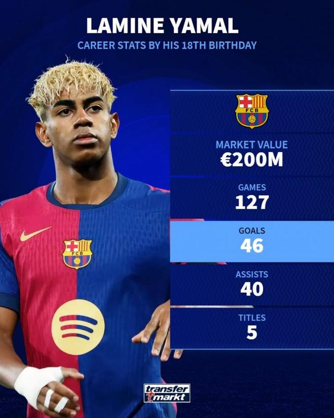 在比較權威的身價統(tǒng)計網(wǎng)站《德國轉會市場》上,亞馬爾的身價已經躥升至2億歐元,他也成功超越了哈蘭德和姆巴佩,成為了當今世界足壇身價最高的球員。